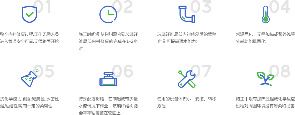 树脂固化内衬局部修复法是和CIPP翻转整体内衬相似的一种技术,其原理是将含有促进剂的特种树脂涂抹在玻璃纤维材料上,接着将纤维材料包裹在修复气塞上,然后放入待修复的管道,定位后,充气,以便含有树脂的纤维材料紧紧地贴在管壁上,最后采用常温固化方式,使得树脂发生化学反应,最终生成玻璃纤维增强塑料。